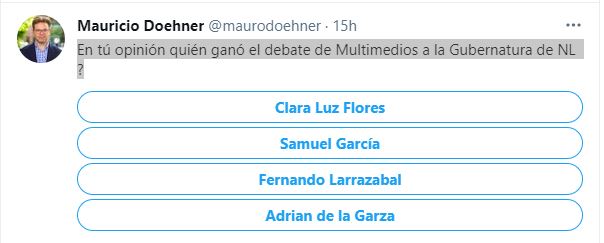 in Elecciones En tú opinión quién ganó el debate de Multimedios a la Gubernatura de NL ? Por politikred 3 de mayo de 2021, 17:38 2k Vistas En tú opinión quién ganó el debate de Multimedios a la Gubernatura de NL ?— Mauricio Doehner (@maurodoehner) May 3, 2021 Leer más tarde Agregar a favoritos Añadir a la colección Reporte Escrito por politikred ¿Qué piensas? 0 Puntos VOTO A FAVOR Voto negativo Browse and manage your votes from your Member Profile Page Comentarios Nuestro sitio Facebook Deja un comentario Cancelar respuestaTu dirección de correo electrónico no será publicada. Los campos obligatorios están marcados con *Comentario * Nombre * Correo electrónico * Web Guardar mi nombre, correo electrónico y sitio web en este navegador para la próxima vez que haga un comentario. Loading… 0